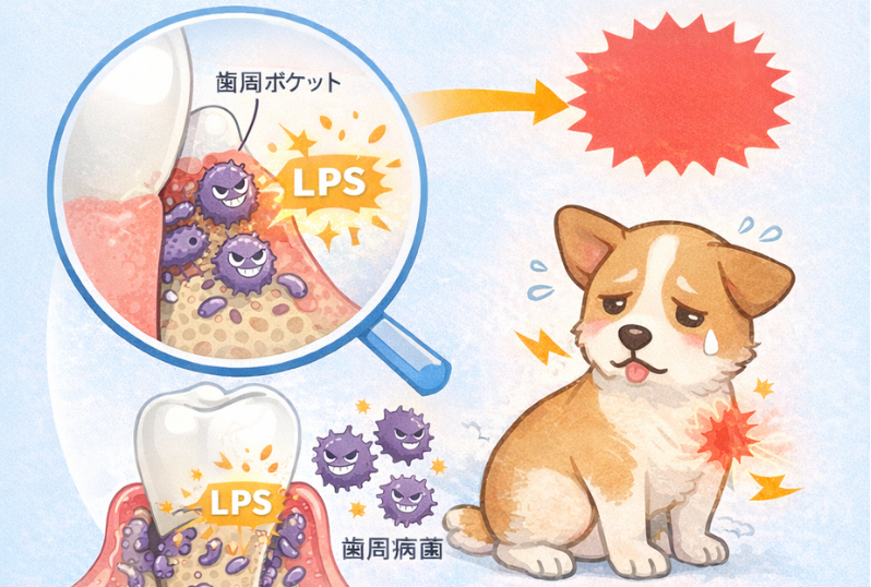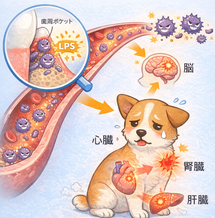 歯ぐきから侵入した歯周病菌の内毒素(LPS:Lipopolyaccharide)が血流に乗り、心臓の僧帽弁に慢性的な炎症を引き起こします。口腔ケア(歯磨き)は、心臓を守るための直接的な治療・予防の一環となります。症 #慢性腎臓病 #LPS