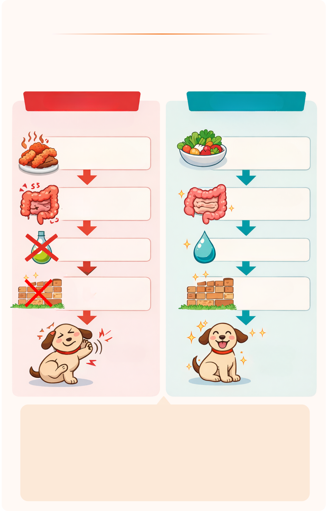 皮膚バリアの材料となる脂肪酸が不足することで低下します。高温製造のフードに含まれる糖化タンパク質(アクリルアミド)が腸の働きに影響し、吸収が低下することがあります。
